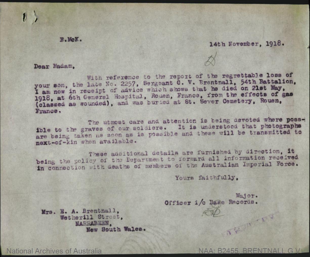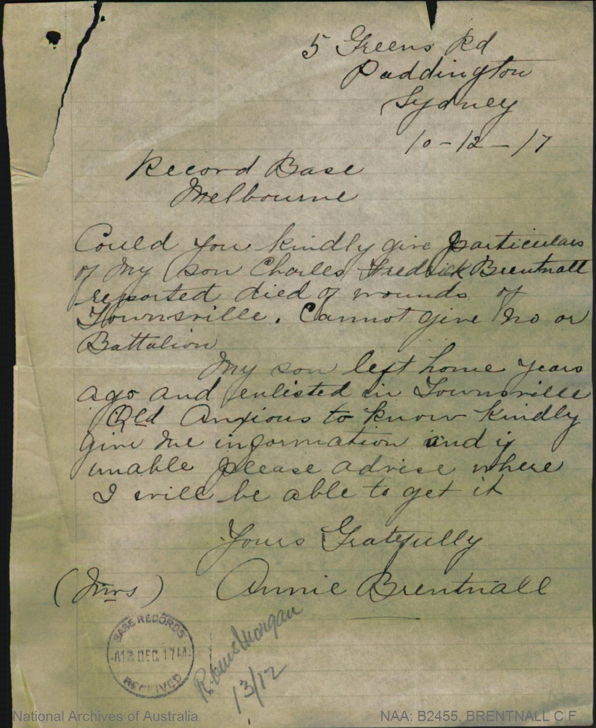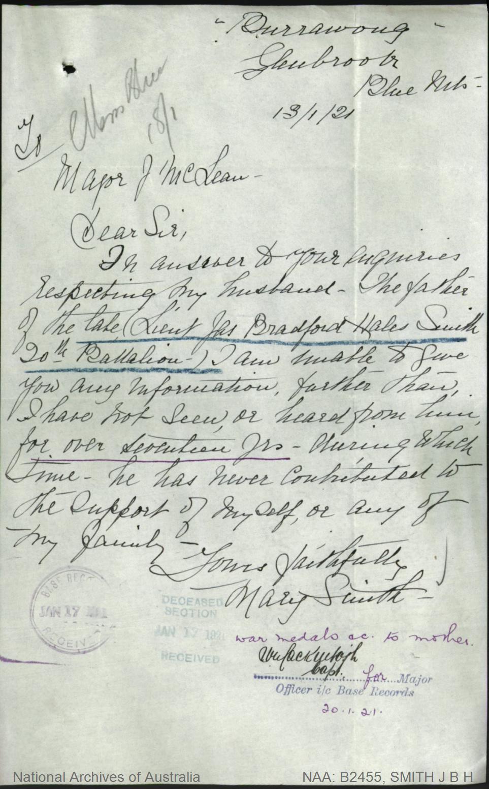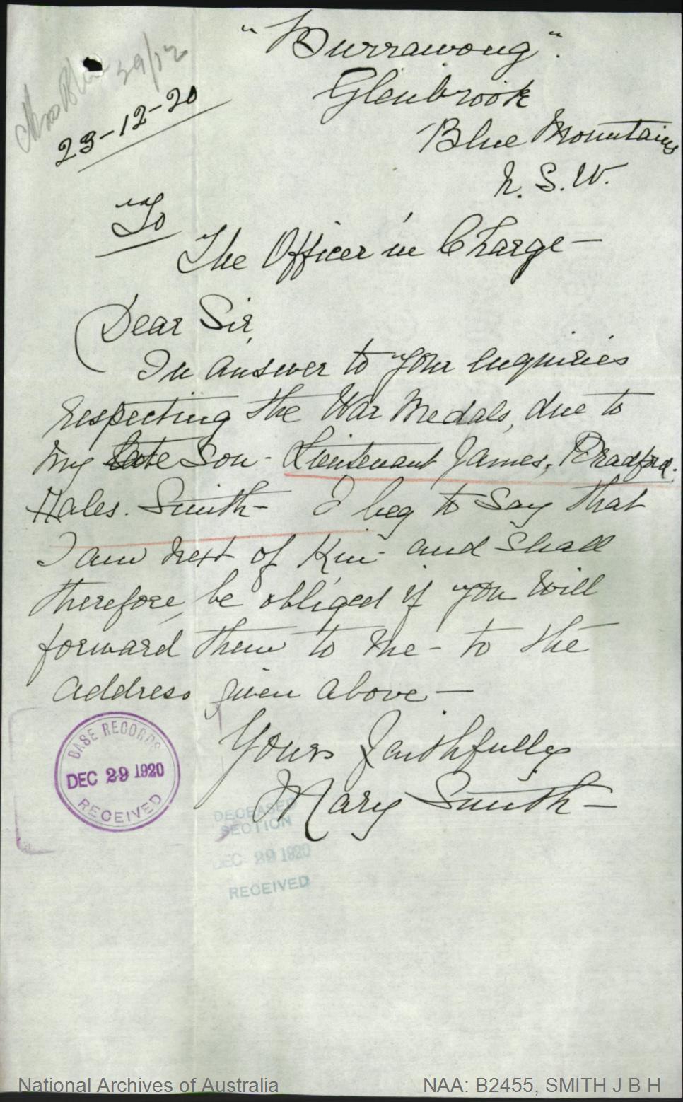 After her son James died Mary moved to Marrickville and then to a cottage at the foot of the Blue Mountains. By the early 1920's she received, regarding her eldest son: