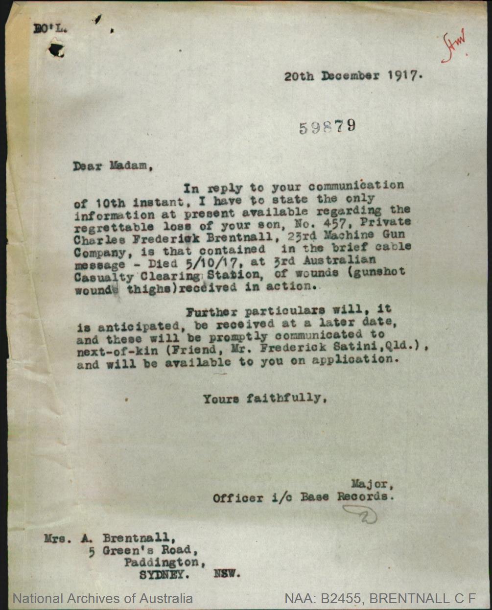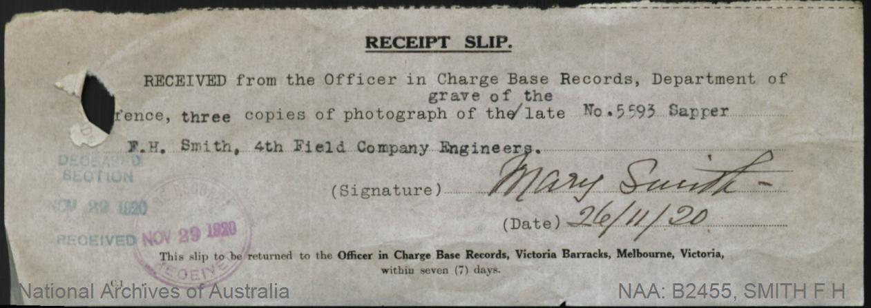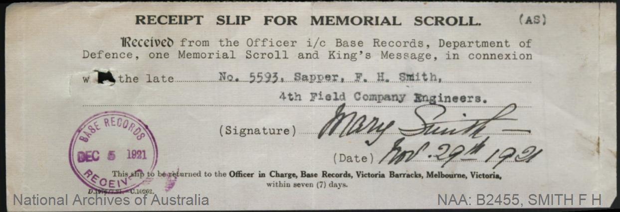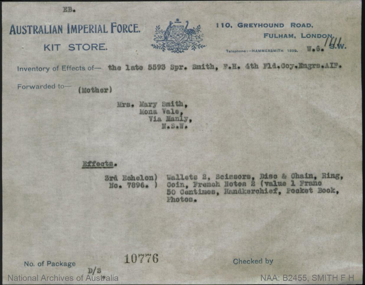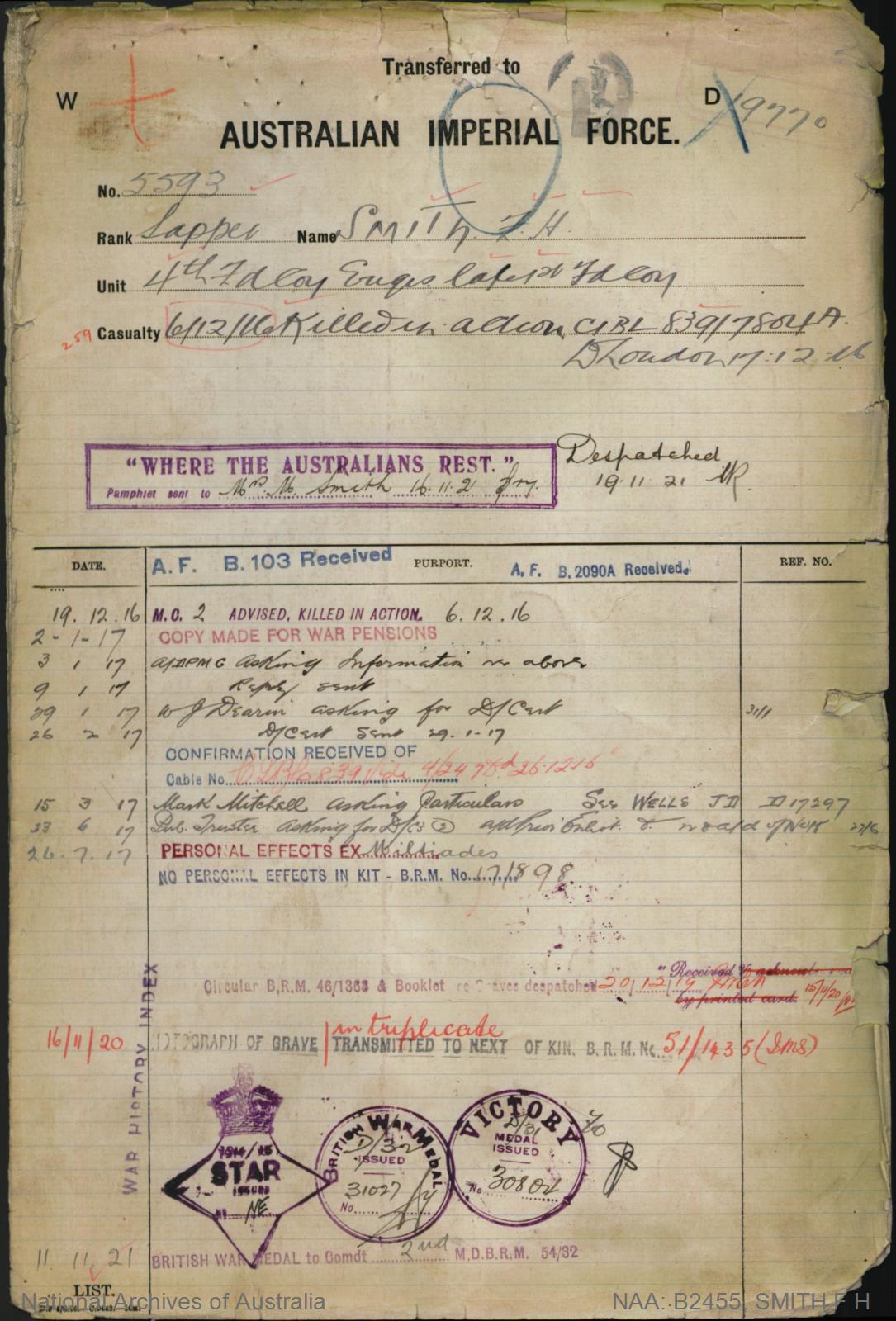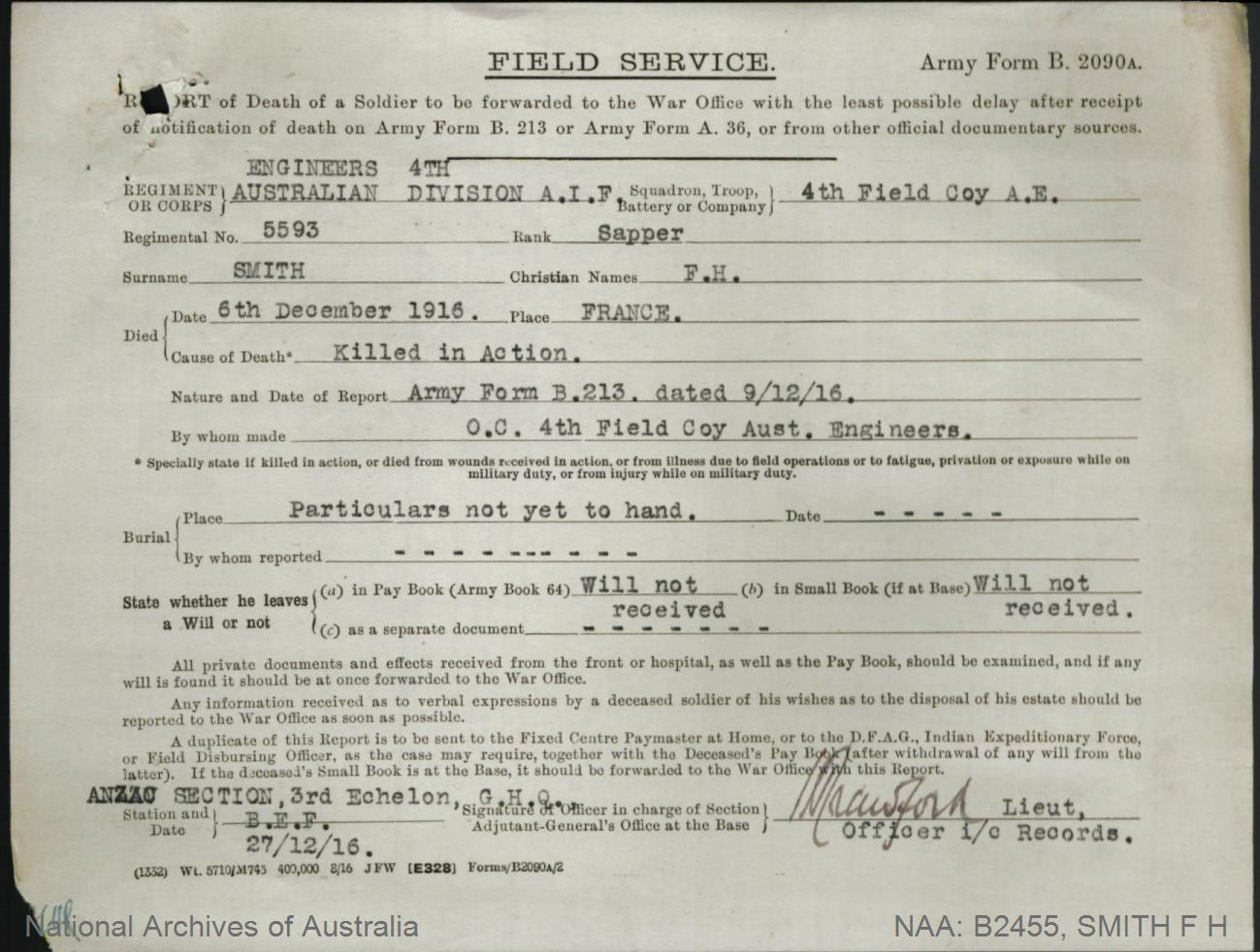 SMITH.—Killed in action December 6 1916 Sapper Frederick Haynes Smith dearly loved eldest son of Mrs. Hales Smith Mona Vale. His duty done. Family Notices (1916, December 30). The Sydney Morning Herald (NSW : 1842 - 1954), p. 10. Retrieved from http://nla.gov.au/nla.news-article15682430
