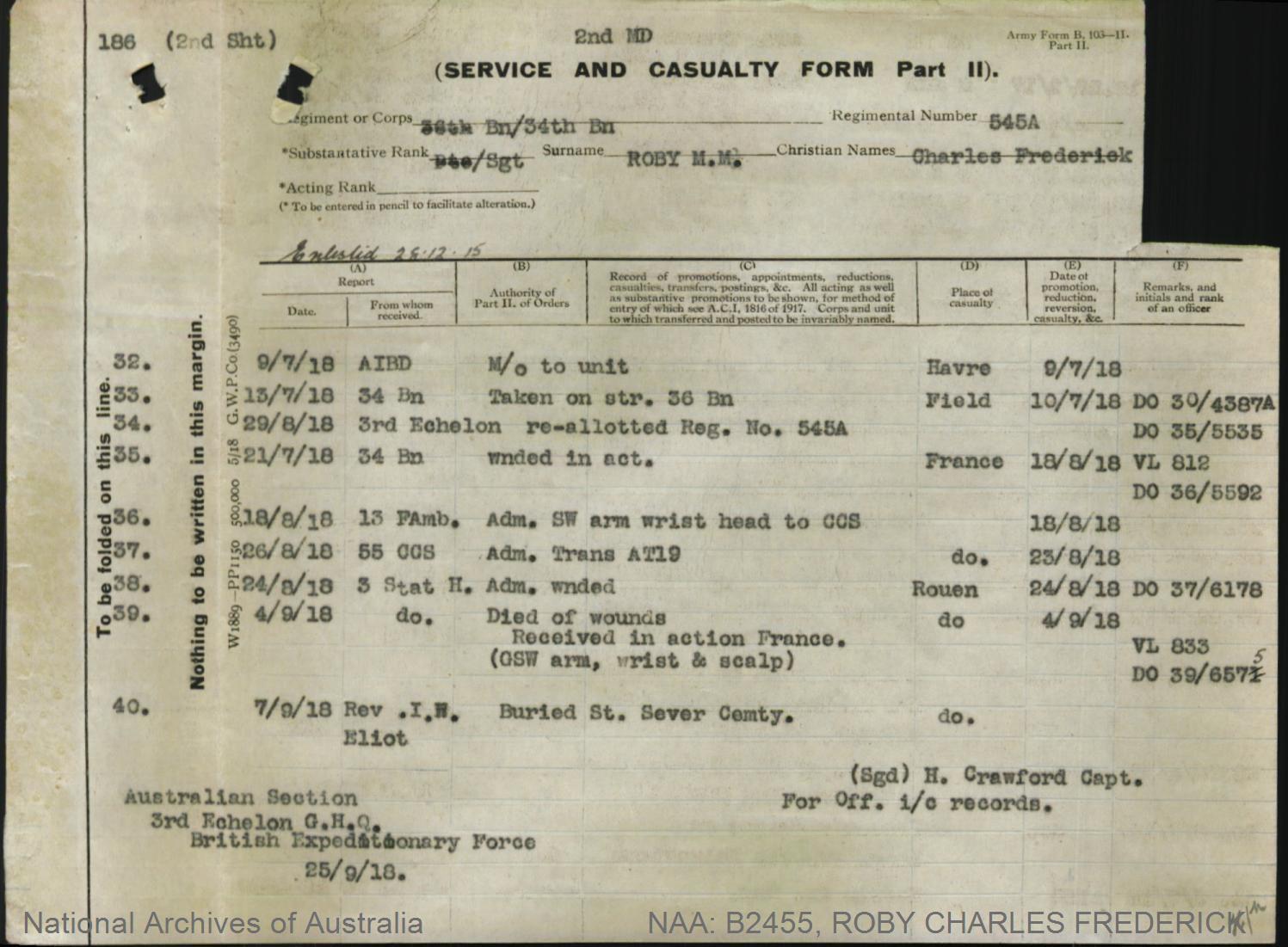 He rejoined his unit on July 6th, 1918. On July 31st he was wounded again, his 4th occasion, again with shrapnel, severely this time. He was transferred by the 6th Australian Field Ambulance admitted to the 5th Casualty Clearing Station where he died of his wounds on August 2nd, 1918.