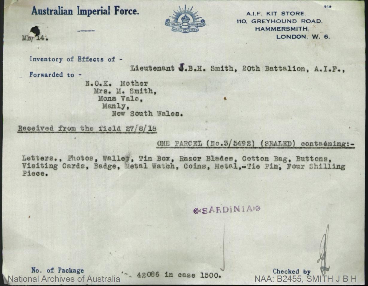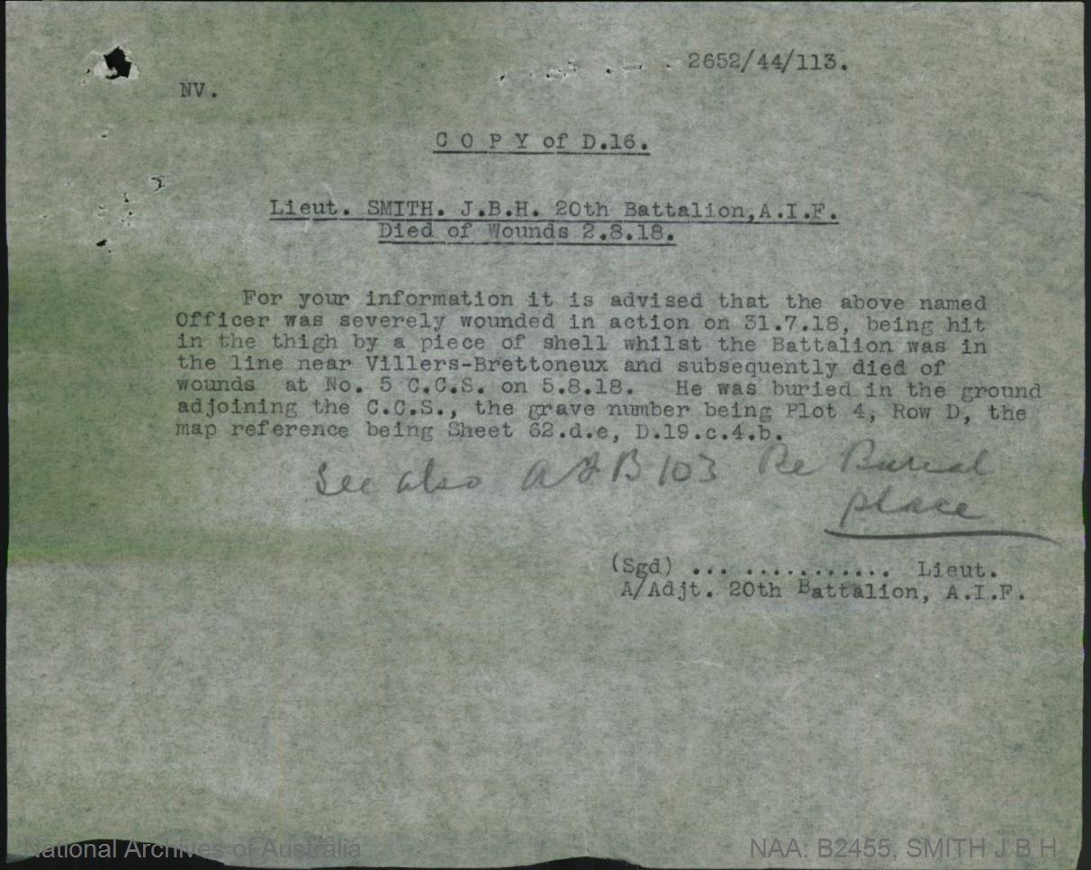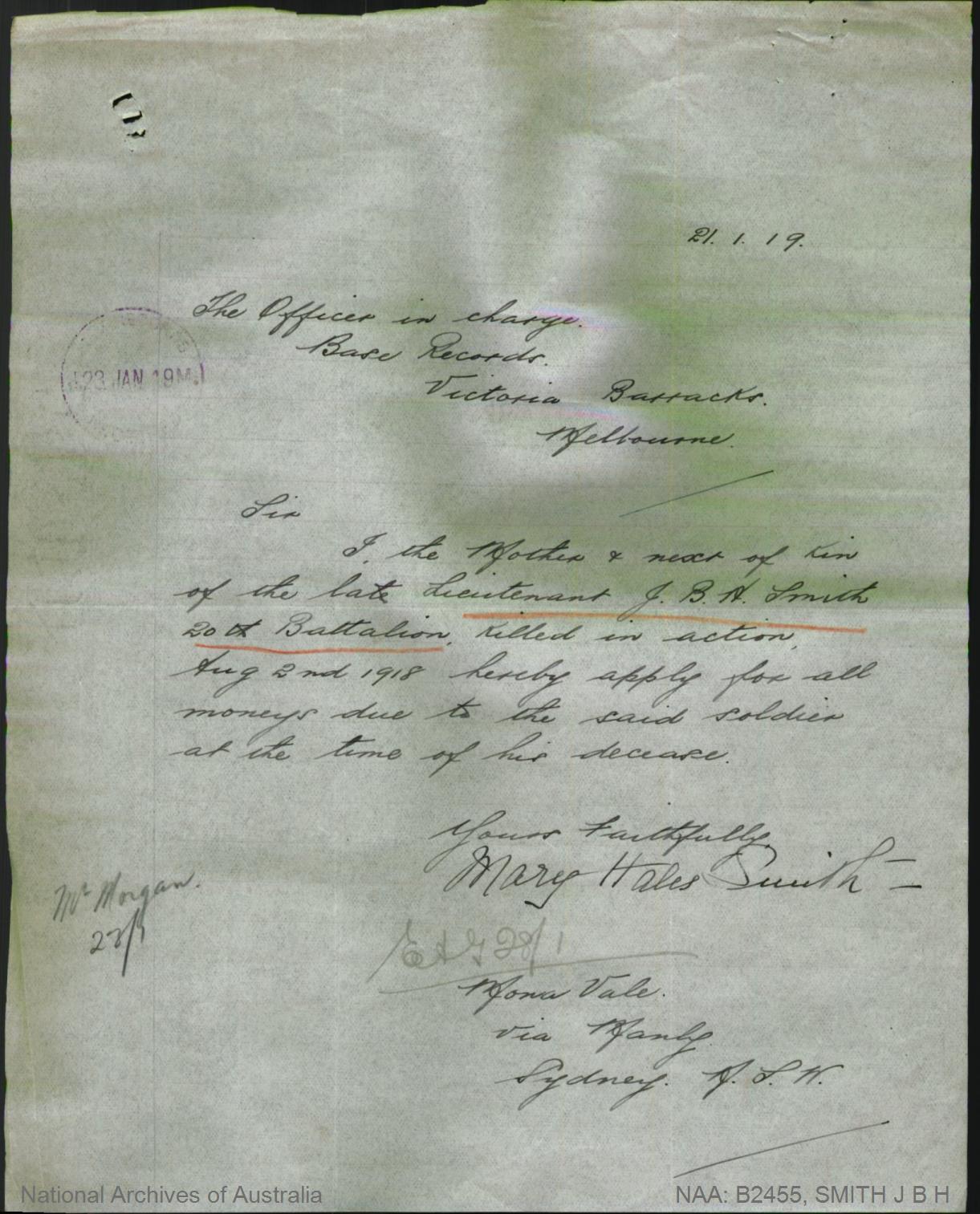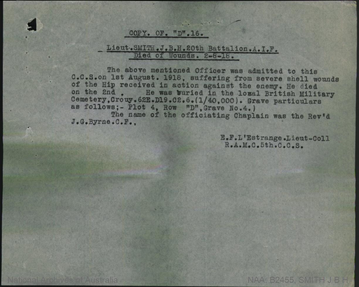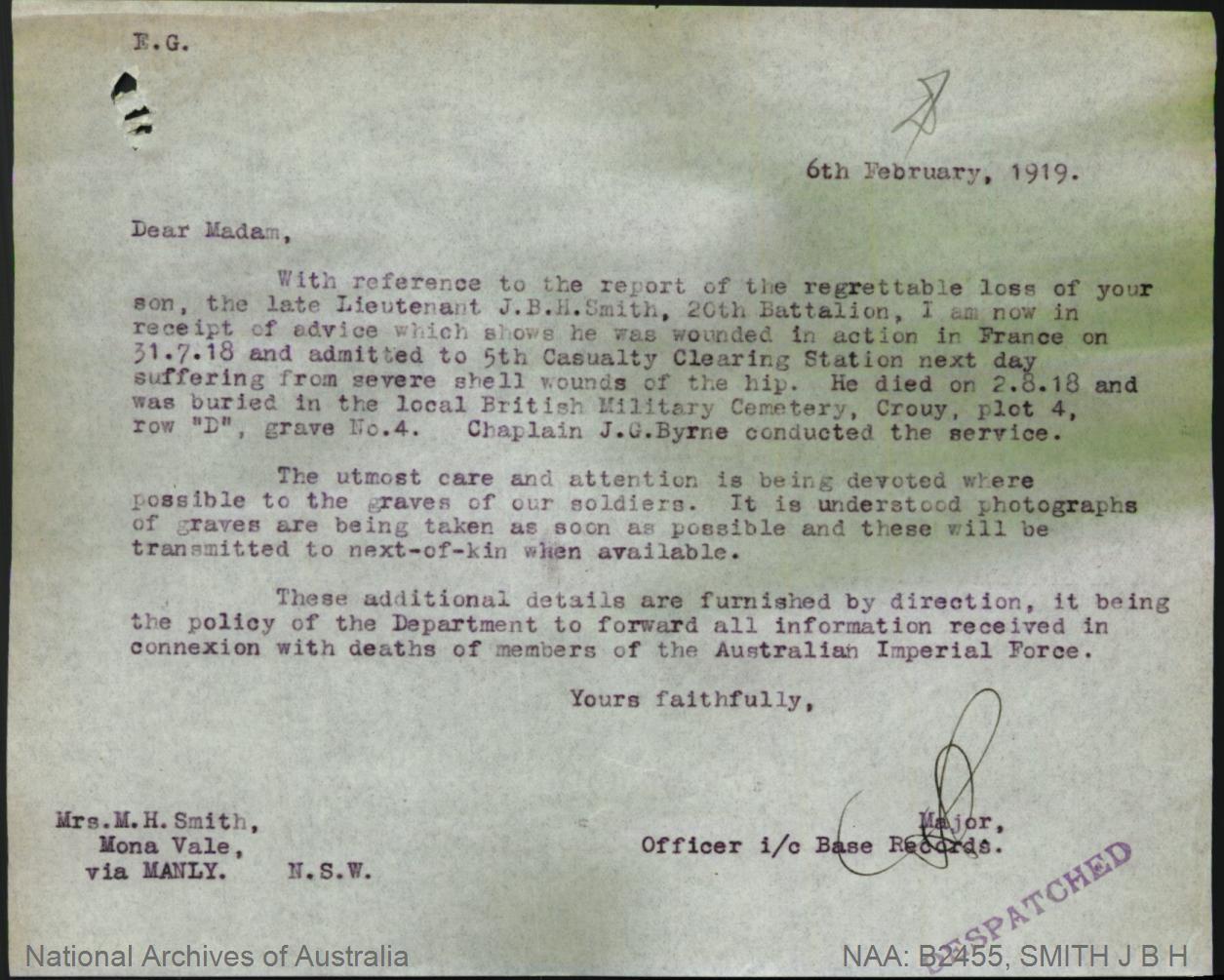SMITH.—Died of wounds, August 2, 1918, Lieut. James Bradford Hales Smith, dearly loved youngest son of Mrs. Hales Smith, Mona Vale, in his 25th year. His duty done. Family Notices (1918, August 17). The Sydney Morning Herald (NSW : 1842 - 1954), p. 12. Retrieved from http://nla.gov.au/nla.news-article15798616