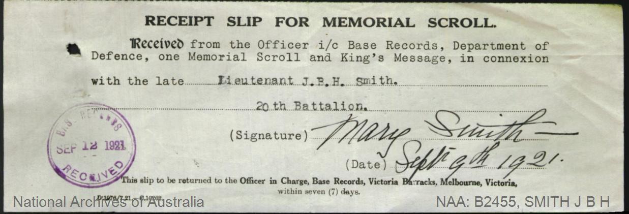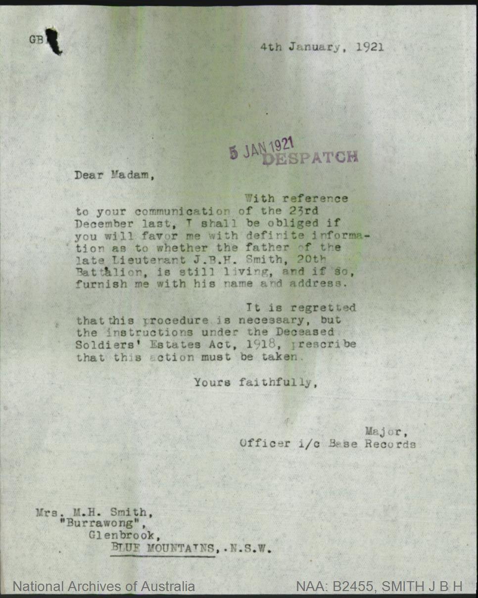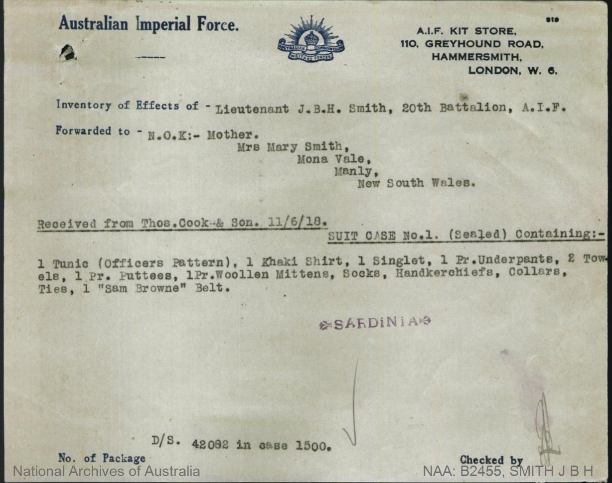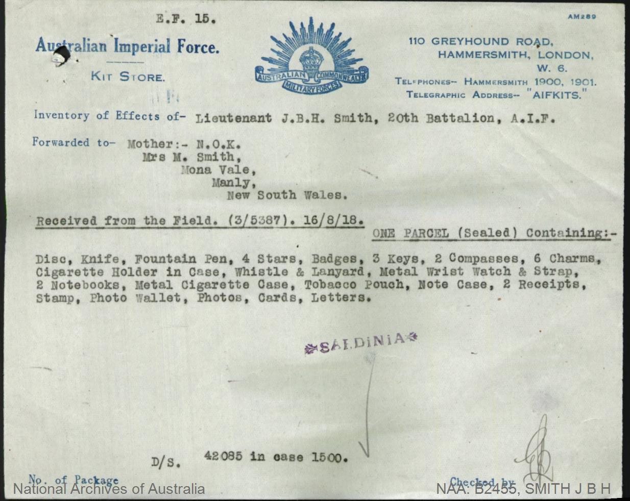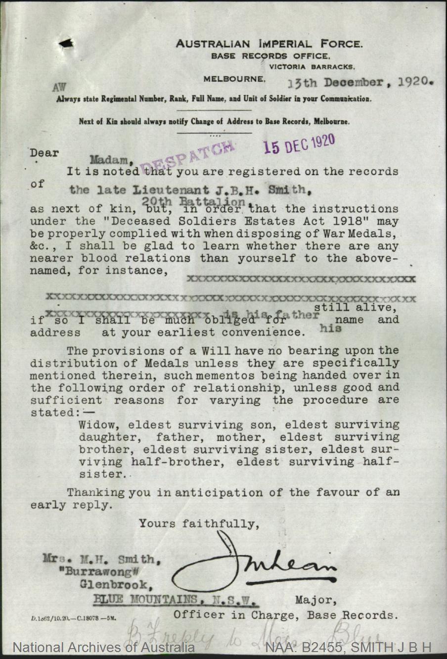 SMITH.—Died of wounds, August 2, 1918, Lieut. James Bradford Hales Smith, dearly loved youngest son of Mrs. Hales Smith, Mona Vale, in his 25th year. His duty done. Family Notices (1918, August 17). The Sydney Morning Herald (NSW : 1842 - 1954), p. 12. Retrieved from http://nla.gov.au/nla.news-article15798616