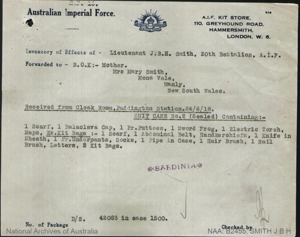 When researching Mona Vale people who served in World War One the National Archives of Australia's War Record documents showed those who had been killed on the fields of France had had what effects of these sons had left behind in that foreign place were often delivered around Christmas or other anniversaries to their relatives.