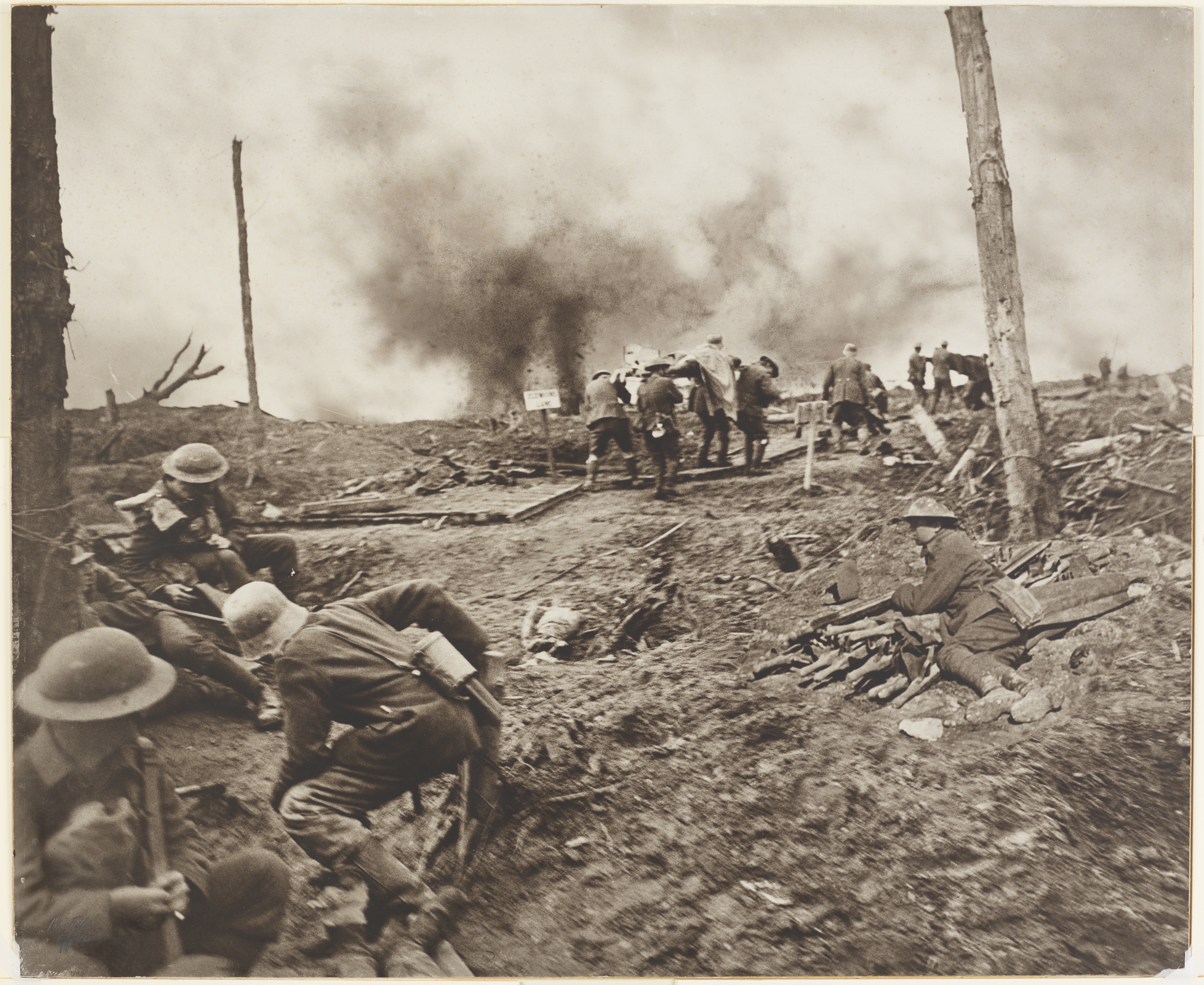 Carrying in the wounded during the height of battle. (located at XV*/Wor W 1/3). From Exhibition of war photographs / taken by Capt. F. Hurley, August 1917- August 1918, courtesy State Library of New South Wales.