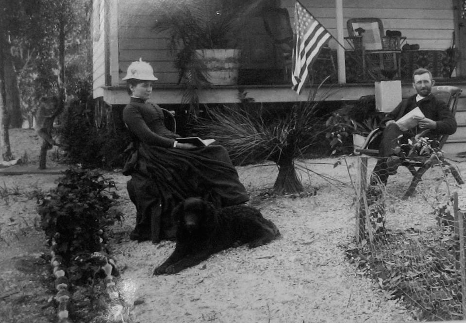 Edwin Morse,the American bridge engineer and his wife Elizabeth sitting in front of their cottage on the island in 1887 koala in background