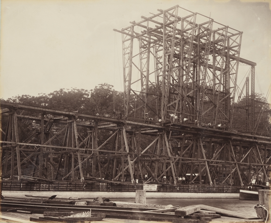 Each of the piers for the bridge-six in number-will consist of a wrought-iron caisson, with three central tubes which assume a conical shape towards the bottom, thus forming a cutting edge. The caisson is sunk by excavating through the tubes. When complete, or sunk into proper position, the caisson and tubes are filled with concrete, and ashlar masonry is continued from low-water mark to the under side of the girders, which rest upon the stonework. The structure itself will be what is known as a lattice-girder bridge, of American design. The top boom is to be of trough form, with horizontal and vertical plates and angle irons. The bottom boom, or chord, will consist of a number of eyebars, threaded together on steel pins. The vertical, or compression members, will consist of wrought-iron columns, formed with plates, angle irons, and latticed com-pound bracing. The tension members will consist of eye-bars, somewhat similar to the bottom chord. There will be seven spans, each measuring 416ft. from centre to centre ; total depth of girders, 60ft. ; height of girders above high-water mark, 45ft. in the clear.