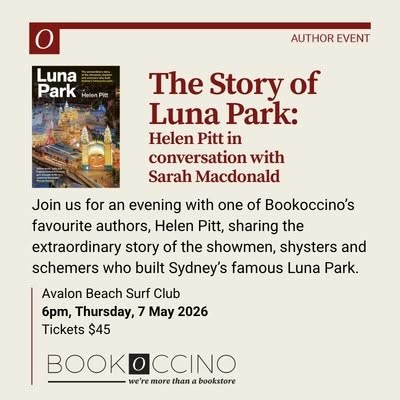 Join us, Thursday 7 May at 6pm at the Avalon Beach Surf Club, for a special evening with one of Bookoccino’s favourite authors, Helen Pitt, sharing the extraordinary story of the showmen, shysters and schemers who built Sydney’s famous Luna Park.