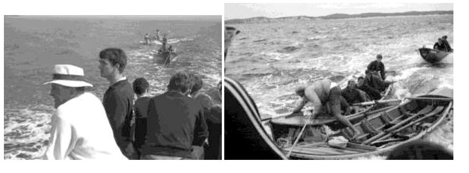 Another feature of the 50’s and 60’s was the mode of transport to carnivals for the crews. The photos above are of crews being towed across Port Phillip from Point Lonsdale to a carnival across at Portsea. As can be seen several boats in the tow line with crews stationed in each boat. This was a very common occurrence back in the clinker boat era in Sydney.