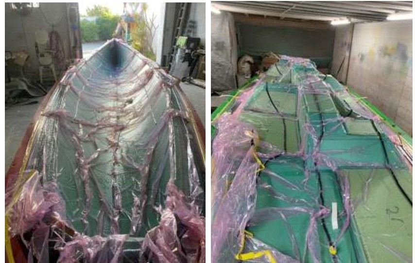 The game changer for the composite builders was the introduction of the “Infusion” method of applying the resin. The Infusion method basically is one very big plastic vacuum bag that is tapped around the outside of the hull mould and draped inside. A large vacuum pump type machine is then connected to an outlet suction hose and a second inlet hose to the resin. The resin is then basically sucked inside and through the foam and glass laminate under the plastic bag. Under immense pressure, the resin is forced or sucked right through the hull, filling every hole and crevice in the foam until it is drawn right up to the gunwale level. This is a very accurate method of applying the resin and can control the thickness of resin to extremely small margins, providing a boat of very consistent weight.
