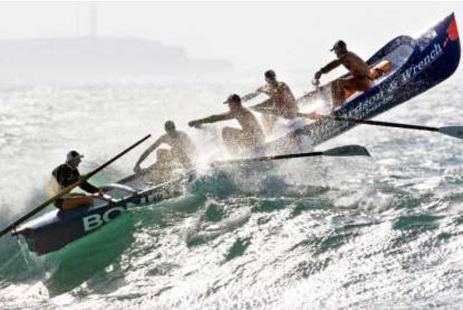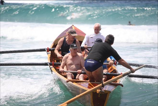 Perry surfboat in the hands of Nathan and Manly LSC men