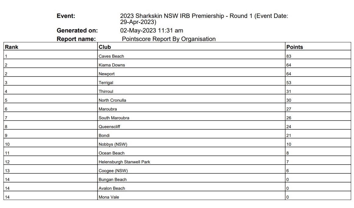 2023 Sharkskin NSW IRB Premiership - Round 1 (Event Date: 29-Apr-2023) results: