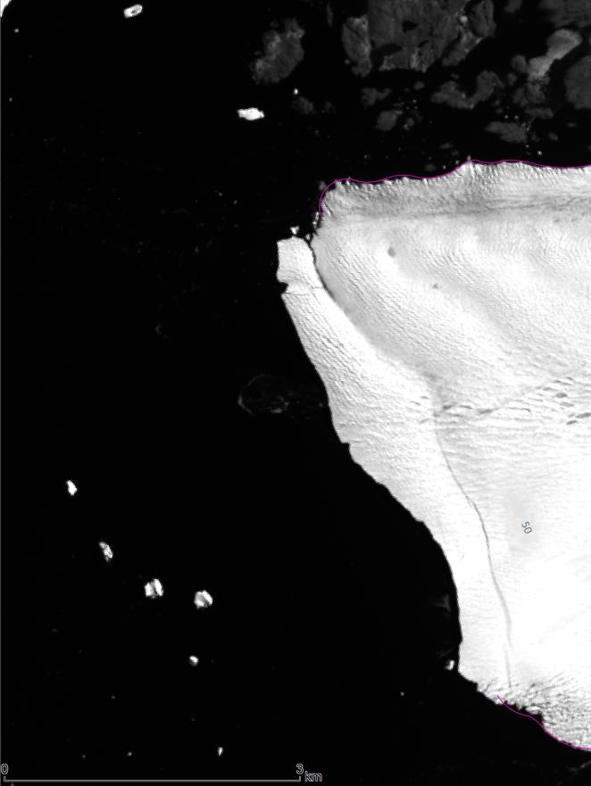 Landsat satellite image, shows a crack parallel with the left edge of the ice shelf prior to calving. Credit: Eleri Evans