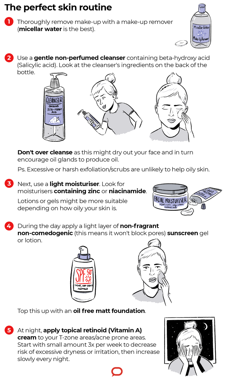 - Use oil-free and non-comedogenic cleansers, moisturisers and make up. When picking a foundation opt for “oil free” liquid silicone (dimethicone or cyclomethicone) matte foundations over oil foundations