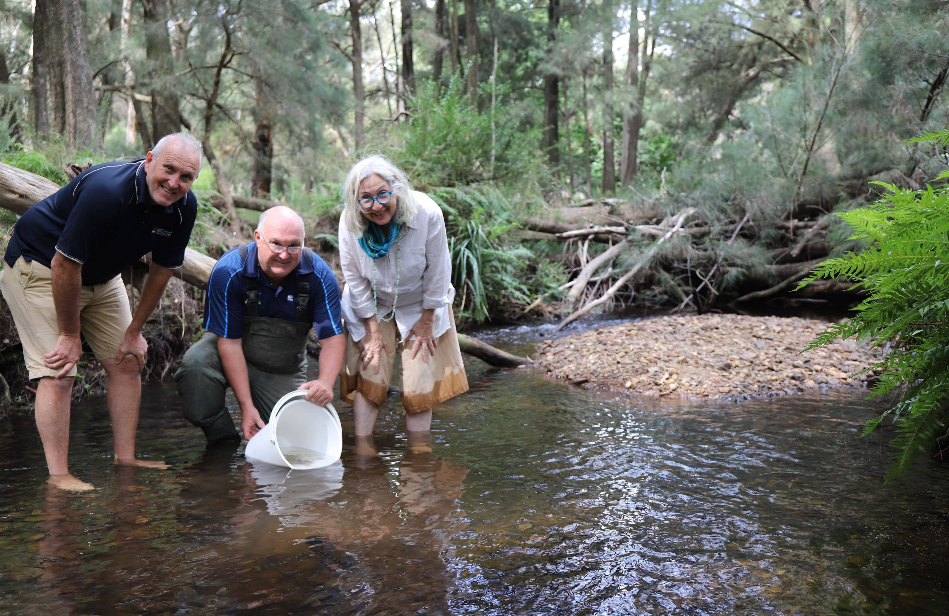 (L-R) Stewart Fielder, Dean Gilligan and Abagail Elizur releasing Macquarie Perch into the Macquarie River catchment. Image courtesy NSW DPI