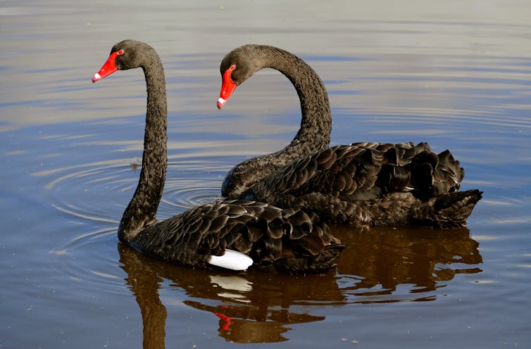 Right now, the breeding season of the black swan is in full swing across southern Australia, having recently ended in the north. In waterways and wetlands, people are seeing pairs of swans — a quarter of which are same-sex — tending carefully to their cygnets, seeing off potential threats with elaborate triumph ceremonies, or gliding elegantly across the water, black feathers gleaming in the winter sun.