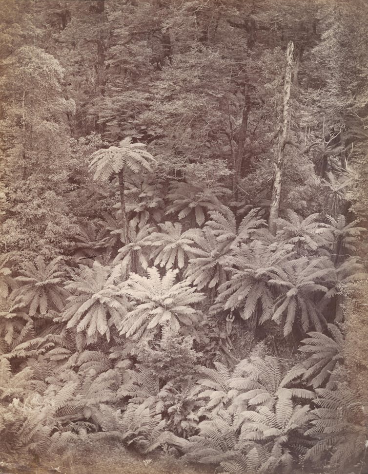 An Anson Brothers image from 1887 is quite likely Beattie’s work, showing a stand of ferns on the Huon Road. Unlike Caire’s shot, however, this image includes a group of settlers enjoying exactly the kind of immersion in nature that these photographs were designed to evoke.