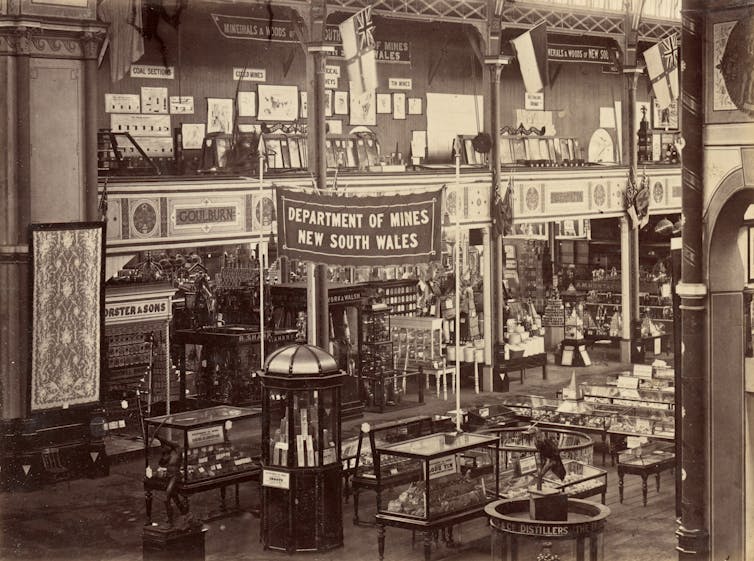 In a photograph from 1879, the NSW Department of Mines filled its portion of the exhibition building, the Garden Palace, with gold ingots, silver ores and samples of tin. On the balconies above were coal sections and geological maps.
