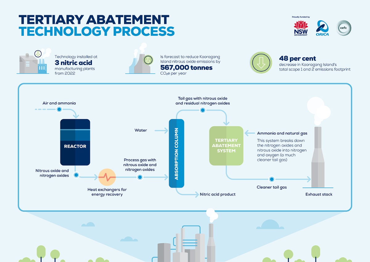 - In 2022, Orica will upgrade three nitric acid processing plants at its Kooragang Island site used in the production of ammonium nitrate, with technology designed to abate nitrous oxide emissions.