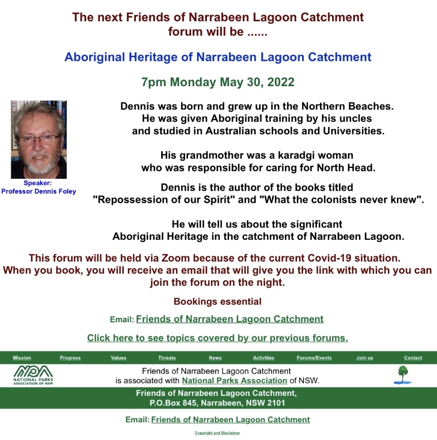 Friends Of Narrabeen Lagoon Catchment Forum: May 2022 - Speaker - Prof. Dennis Foley On The Aboriginal Heritage Of The Narrabeen Lagoon Catchment