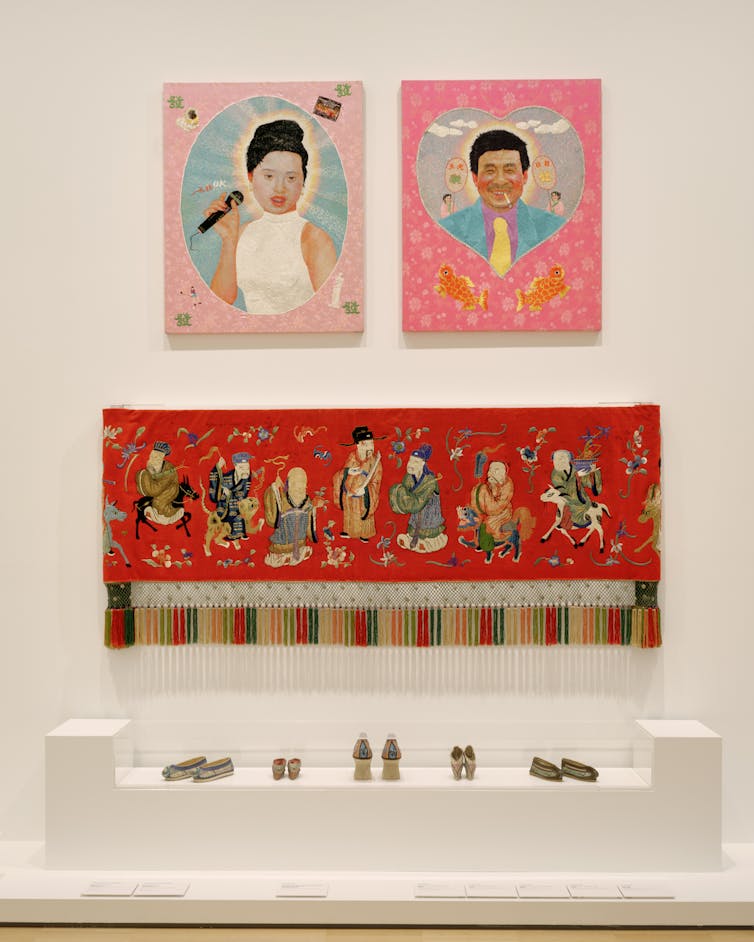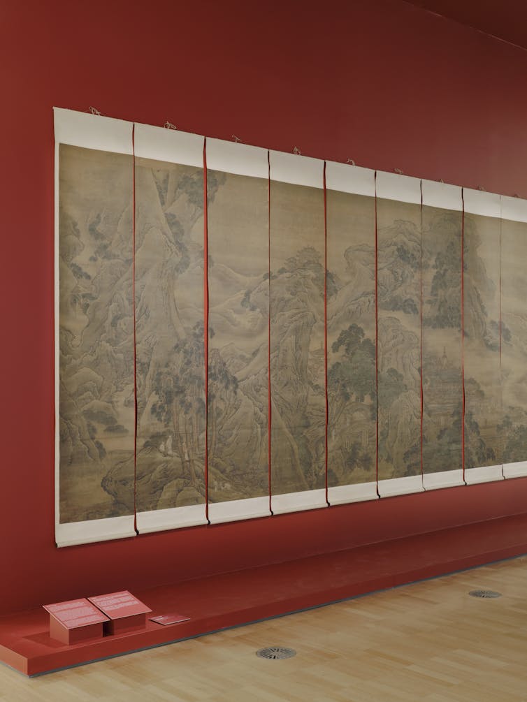 The whole clever display has a moment of dark red tranquillity at its centre, with a wall of 18th century muted painted landscapes facing a 2010 video by Yang Yongliang of Hong Kong-like traffic dwarfed by similar mountains.