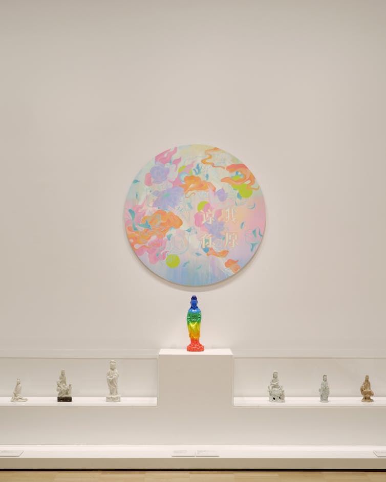 Next to this are deep red richly incised containers and portrait busts, next to the tutti-frutti colours of karaoke pop.