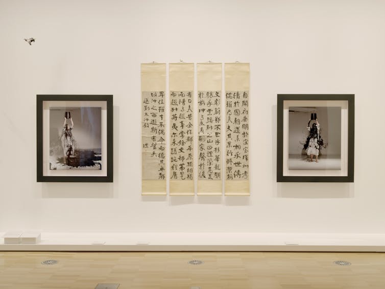 Part of the overt long-term reality around us and seen in the exhibition is the work of artists of Chinese background, who live in Australia. There are the well known fanciful sculptures of Guan Wei and exquisite porcelain busts of Ah Xian, sitting alongside work by emerging artists like the witty photography of Scotty So and ethereal paintings of Louise Zhang.