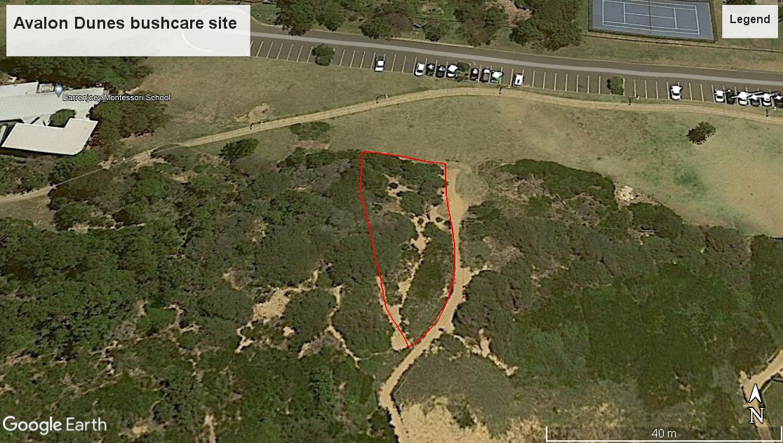 Our bushcare area is within the red lines. We can work in the shade in summer, or in sun in winter. Barrenjoey High school is to the north.