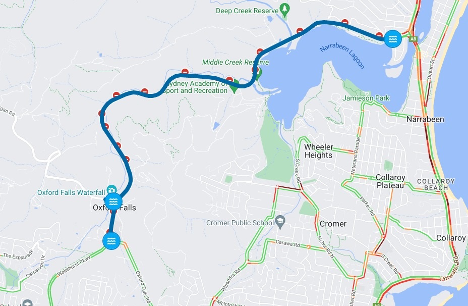Live Traffic reported that the Wakehurst Parkway closed at 8:26pm on Tuesday February 21st 2023 - it had not reopened 12 hours later - 8:27am Wednesday February 22nd 2023. The map from Live Traffic shows the Parkway has flooded at three places along its length, between Dreadnought Road at Frenchs Forest and Wimbledon Avenue at North Narrabeen: