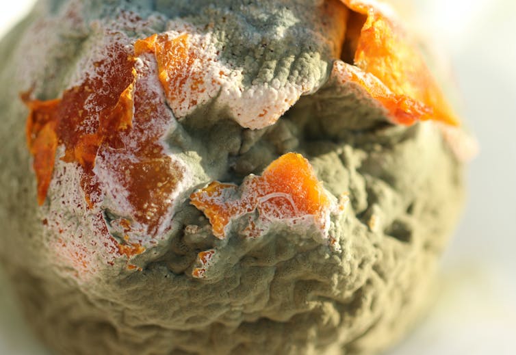 That blue orange I mentioned before, you can thank Penicillium for that. The organism that gives us blue cheese and the antibiotic penicillin is also responsible for producing a dense growth of mould that almost looks like smoke when disturbed, spreading millions of spores onto the rest of your fruit bowl.