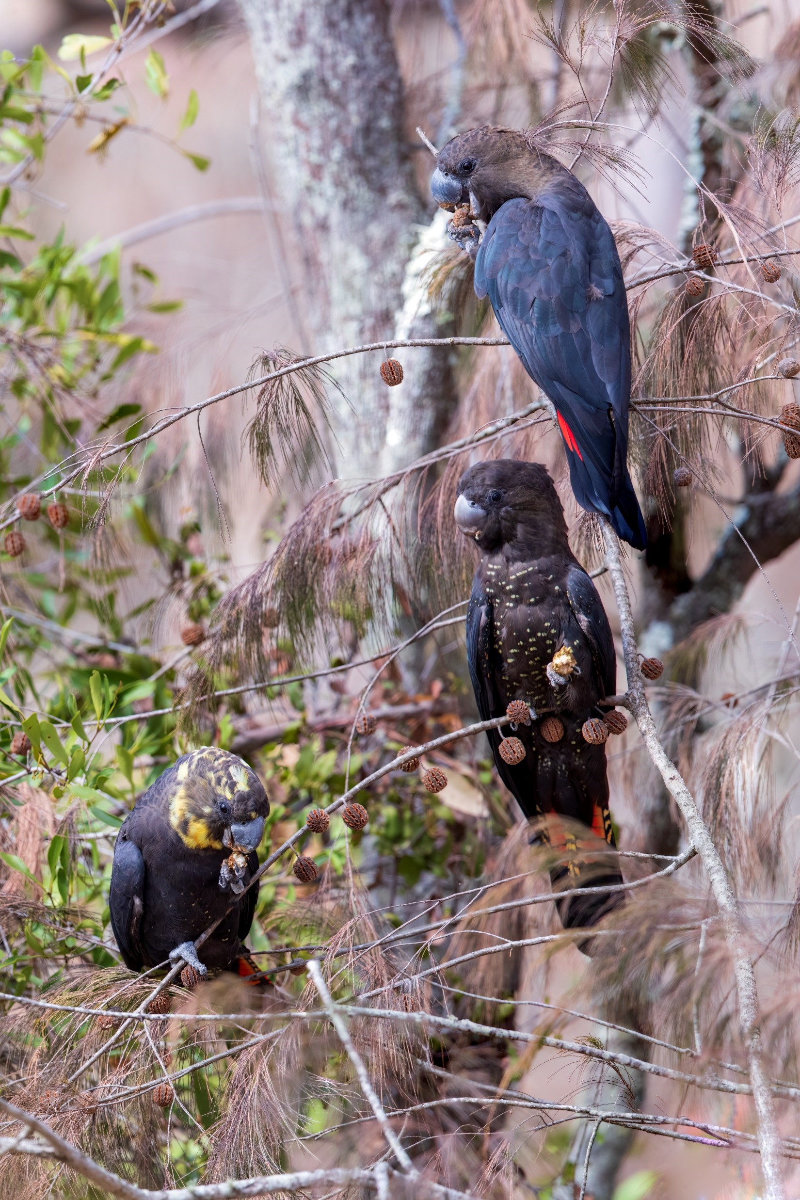 - a female bird (identifiable by yellow on her head) begging and/or being fed by a male (with plain black/brown head and body and unbarred red tail feathers)
