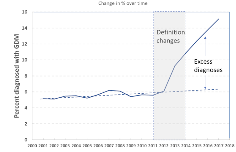 That was not always so. New criteria were developed in 2010 which dropped an initial screening test and lowered the diagnostic set-points. Gestational diabetes diagnoses have since more than doubled.