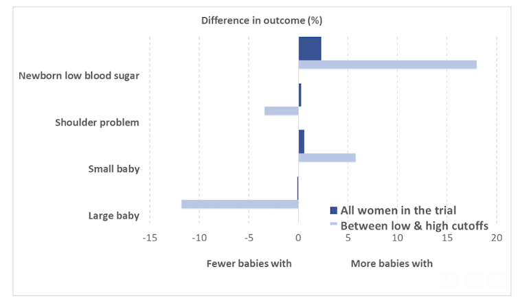 However, the trial found several harms, including more neonatal hypoglycaemia (low blood sugar in newborns), induction of labour, use of diabetic medications including insulin injections, and use of health services.