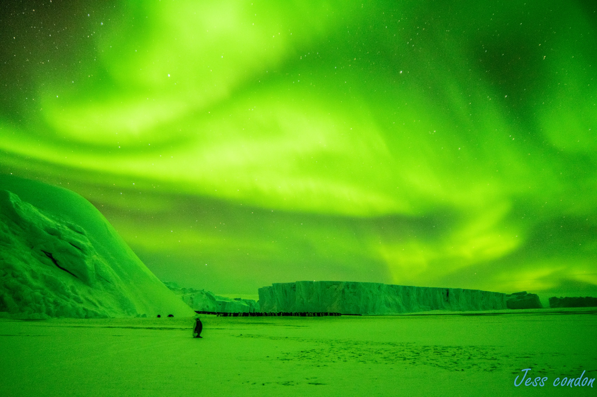 ''Aurora over an Emperor penguin rookery. Emperor's are only found in Antarctica, and are about the size of a 6 year old child, 19/8/23 Mawson Station, Antarctica.'' - Jess
