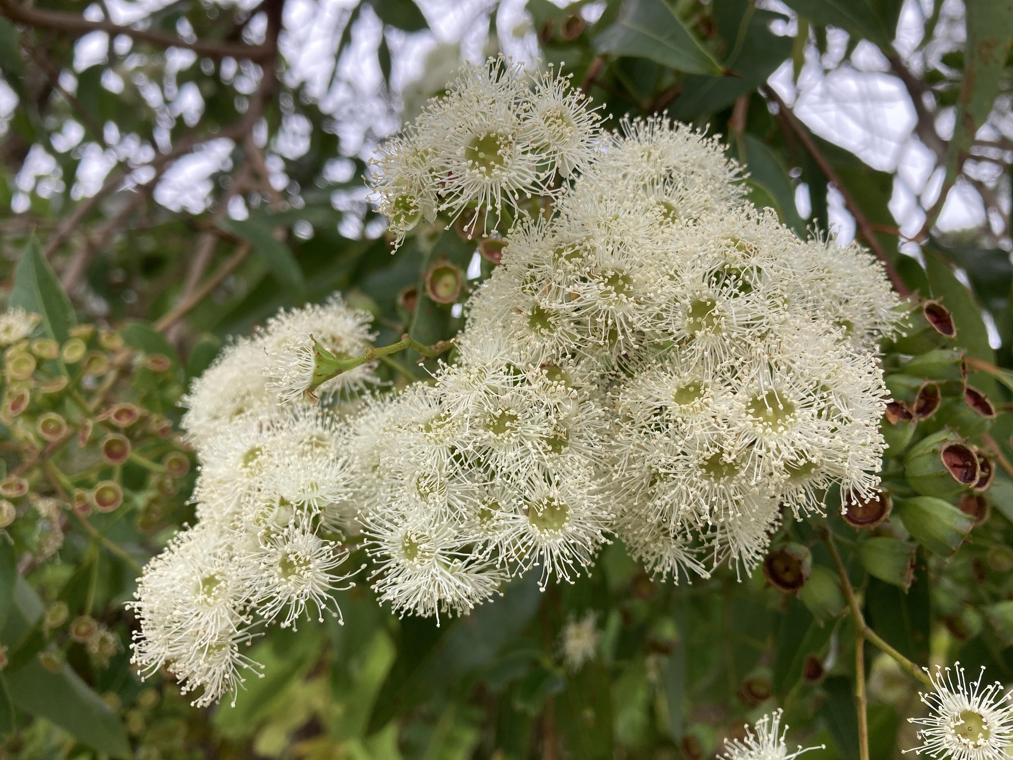 Sydney Red Gum, Angophora costata, has spectacular bark as well as flowers in early Summer. A few weeks later Rough-barked Apple, Angophora floribunda, flowers. This is our latest cover image, a tree in Village Park Mona Vale. Both have masses of flowers on the ends of the branchlets, and unlike eucalypts, their adult foliage is arranged in pairs, or opposite. Eucalypt adult leaves occur on alternate sides along the twigs. Angophora buds and gumnuts have vertical ridges, as on right side of the image.