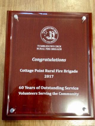 The longevity of the local Rural Fire Service as a vital component in our community is also demonstrated through Long Service Awards for volunteer members and for brigades. In December 2017 Tumbledown Dick Rural Fire Brigade made a visit to Cottage Point Rural Fire Brigade to present a commemorative plaque from Tumble to Cottage Point RFB recognising the 60 years of community service Cottage Point RFB have provided to the community. A great achievement.