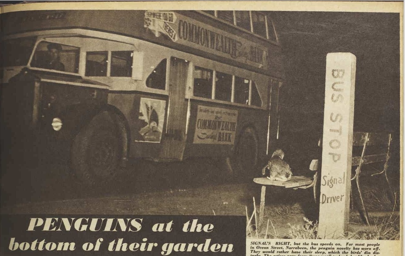 SIGNAL'S RIGHT, but the bus speeds on. For most people in Ocean Street, Narrabeen, the penguin novelty has worn off. They would rather have their sleep, which the birds' din disturbs. The noises vary from "woo-woo" to loud dog-like barks.