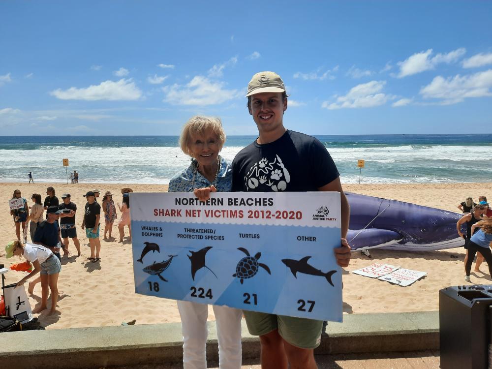 Valerie Taylor AM, 88, and Bailey Mason, not yet 20, attended the Shark Nets Out Now protest at Manly on Saturday December 3rd, 2022