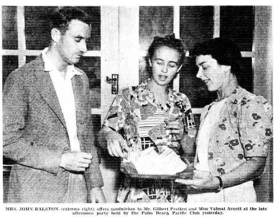 MRS. JOHN RALSTON (extreme right) offers sandwiches to Mr. Gilbert Pratten and Miss Valmai Arnott at the late afternoon party held by the Palm Beach Pacific Club yesterday. Hostesses And Guests At First Party Of Palm Beach Social Season (1938, November 28). The Daily Telegraph (Sydney, NSW : 1931 - 1954), p. 10. Retrieved from http://nla.gov.au/nla.news-article247438723