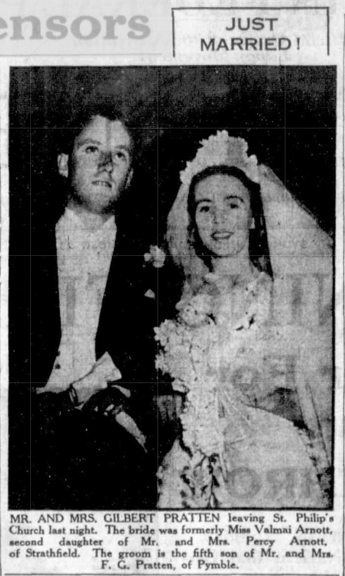 MR. AND MRS, GILBERT PRATTEN leaving St. Philip's Church last night. The bride was formerly Miss Valmai Arnott, second daughter of Mr, and Mrs. Percy Amott, of Strathfield. The groom is the fifth son of Mr. and Mrs. F. G. Pratten, of Pymble. JUST MARRIED ! (1939, November 29). Daily News (Sydney, NSW : 1938 - 1940), p. 2. Retrieved from http://nla.gov.au/nla.news-article236335371