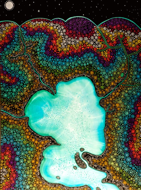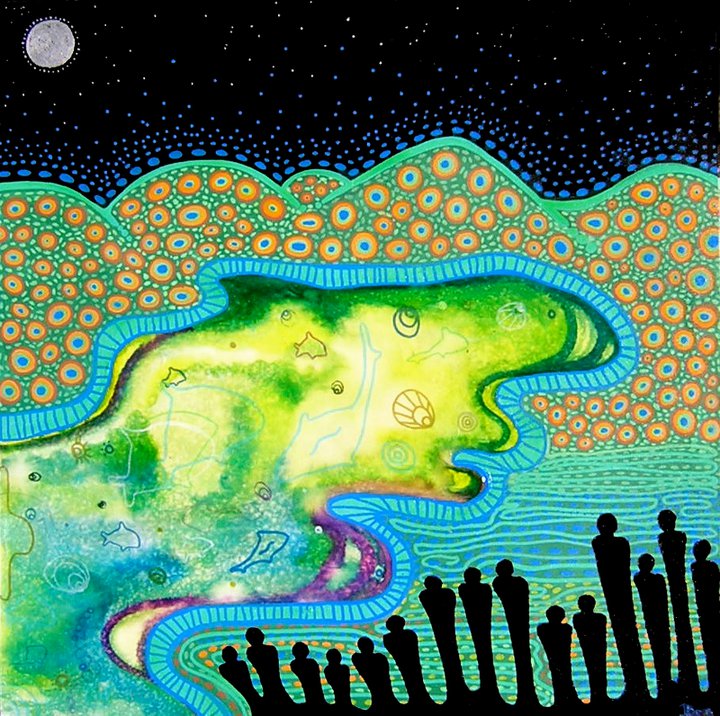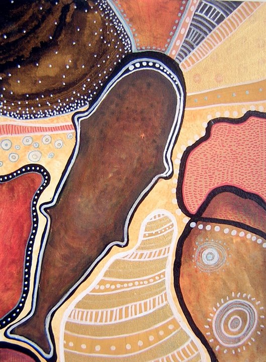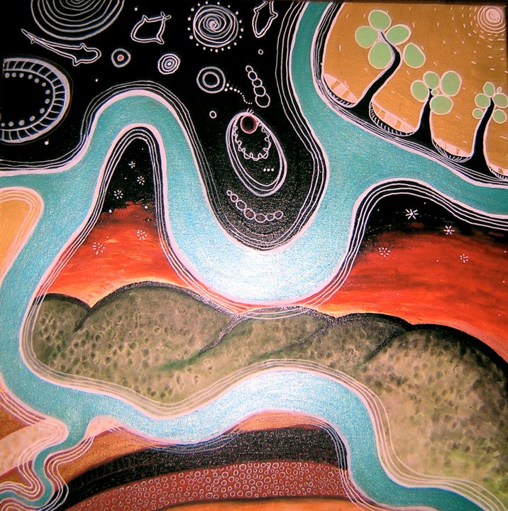 Says Jessica, "This understanding of country allows for a two-way communication to evolve, between those belonging and the country to which they belong. Country is spoken to, sung to, loved and mourned, just as if were a family member. This personification of the landscape allows a more personal interpretation of what lies in it; everything then has a purpose and a story to tell, from the colours of the landscape right down to the stones within it."