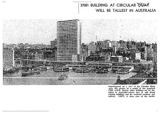 Opened in 1962, the AMP 'Sydney Cove' Building, designed by Peddle Thorp & Walker (now PTW Architects), was Sydney's first to break the city's 150-foot (46-metre) height limit, imposed from 1912. At 117 metres, it was Australia's tallest building, almost double the height of anything else in Sydney at the time. - Sydney Living Museums.