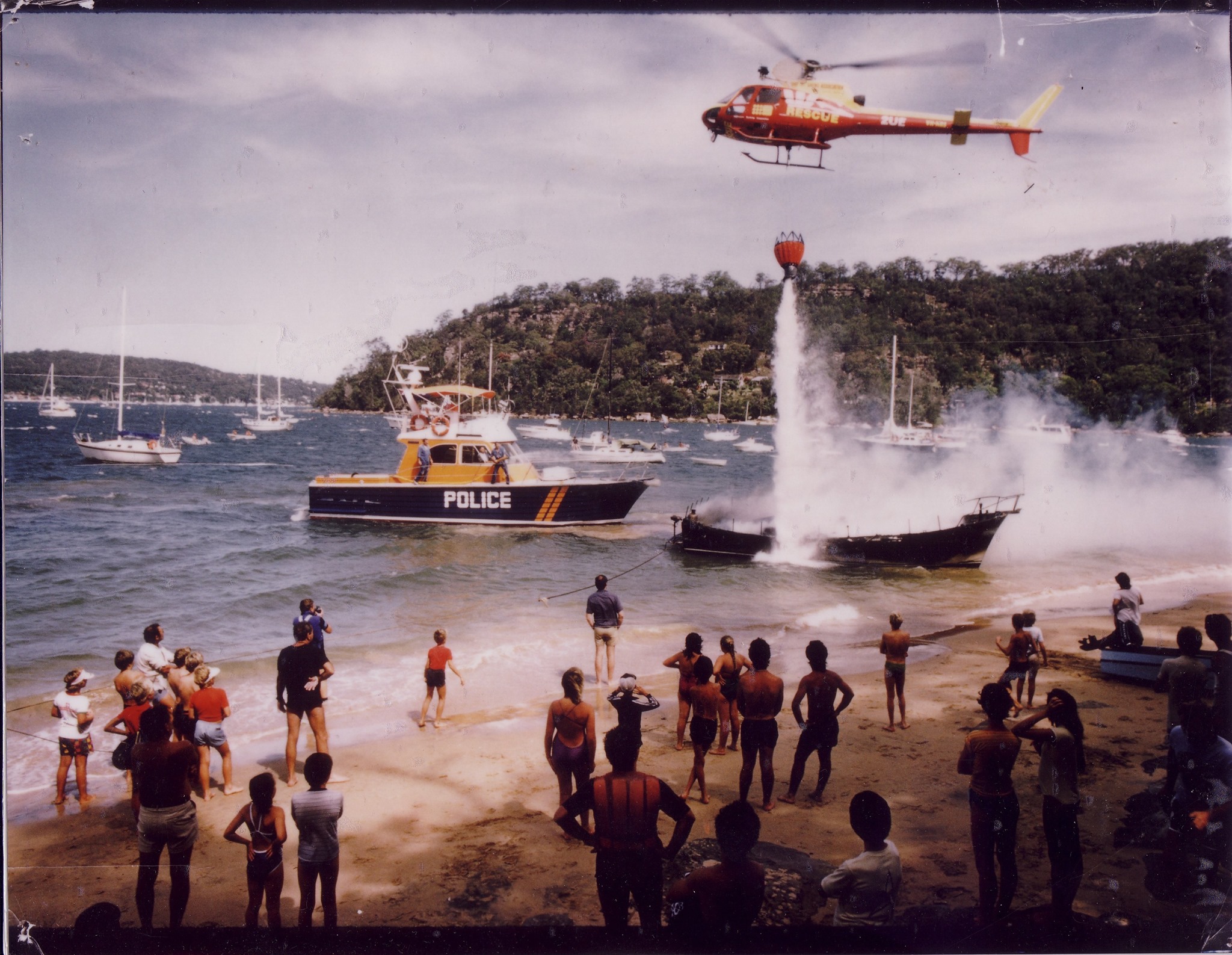 I recall one incident where a cruiser was on fire in The Basin. The fire was approaching a gas tank on the deck of the cruiser and John and Carl turned up, threw an anchor over the bow of the boat as it was burning through the mooring line, and towed it out of there. At that time the camping area was full, people everywhere, boats all around, if it had drifted inshore it would have set alight other boats. John and Carl towed it around to Currawong – I have a photo of a helicopter and the Valiant turning up to put it out.