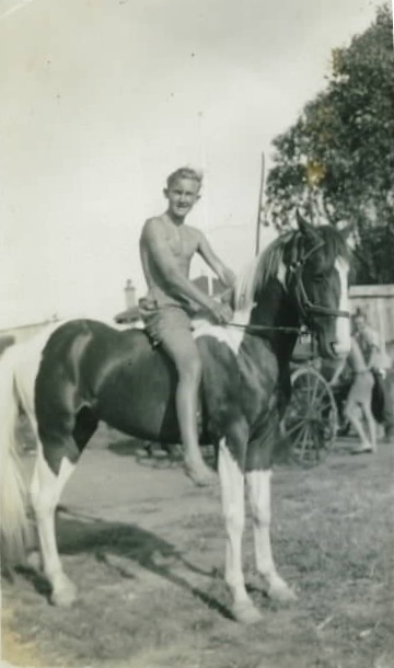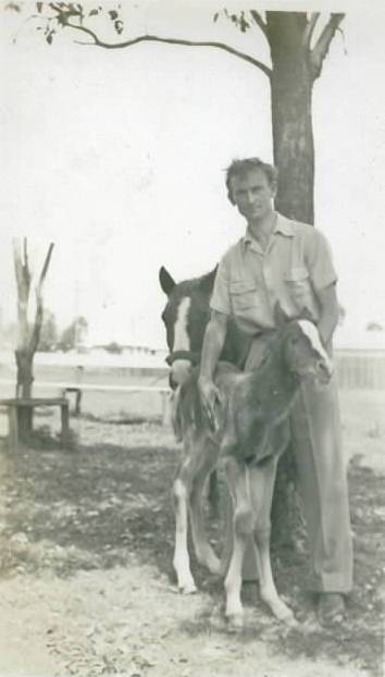 John: Tommy was its name, it had feet like that on it (indicates huge feet). We used to ride double up; that was our first experience. Then we both got so interested in horses we ended up buying and selling horses, then we learnt how to shoe horses, and we'd shoe horses at the Blacksmith Farrier, he'd move away, didn't want his head kicked in or anything, they were bad horses some of them.