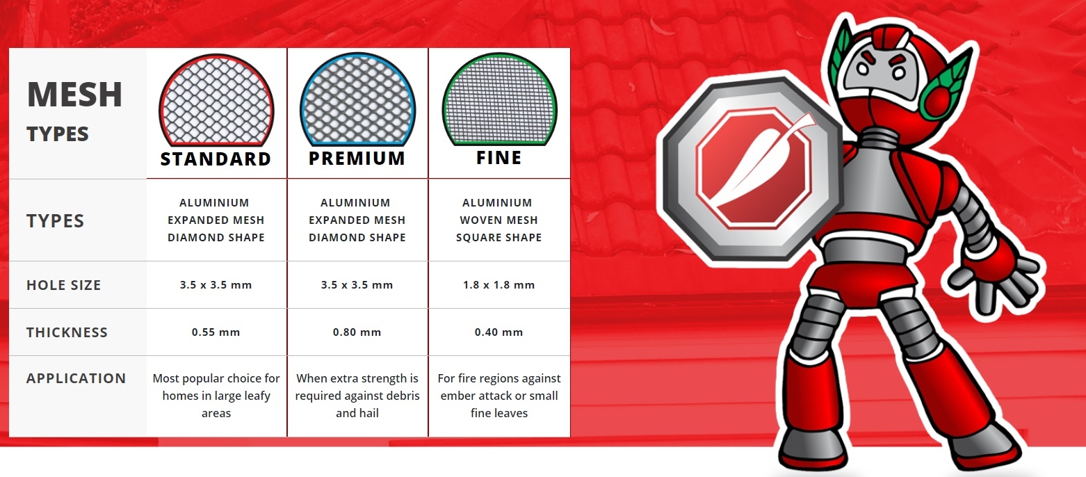 Aluminium mesh keeps pests and leaves out of your gutters and allows water to effectively flow in. In addition, it will not corrode and it’s fire safe.