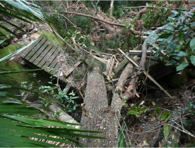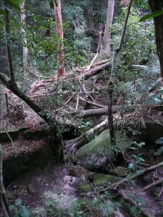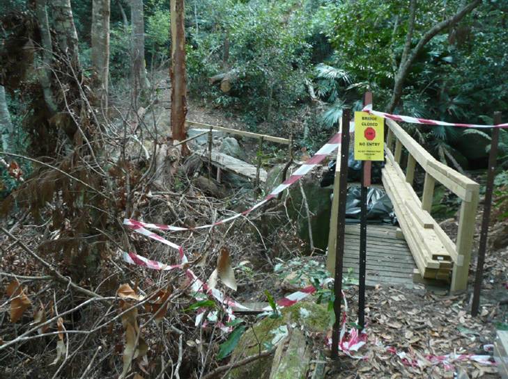 The mass of branches and logs that remains behind in the gully serves as a reminder of the event which saw a giant rough-barked eucalyptus tree fall, also bringing down a large casuarina tree. Both trees fell across the first section of the bridge, totally destroying it and damaging the handrails of the second section. This occurred at a time when the Sanctuary was closed so no visitors were in any danger. The tree appears to have been healthy so it is possible that the fall was due to the waterlogged state of the ground due to heavy rain at the time.
