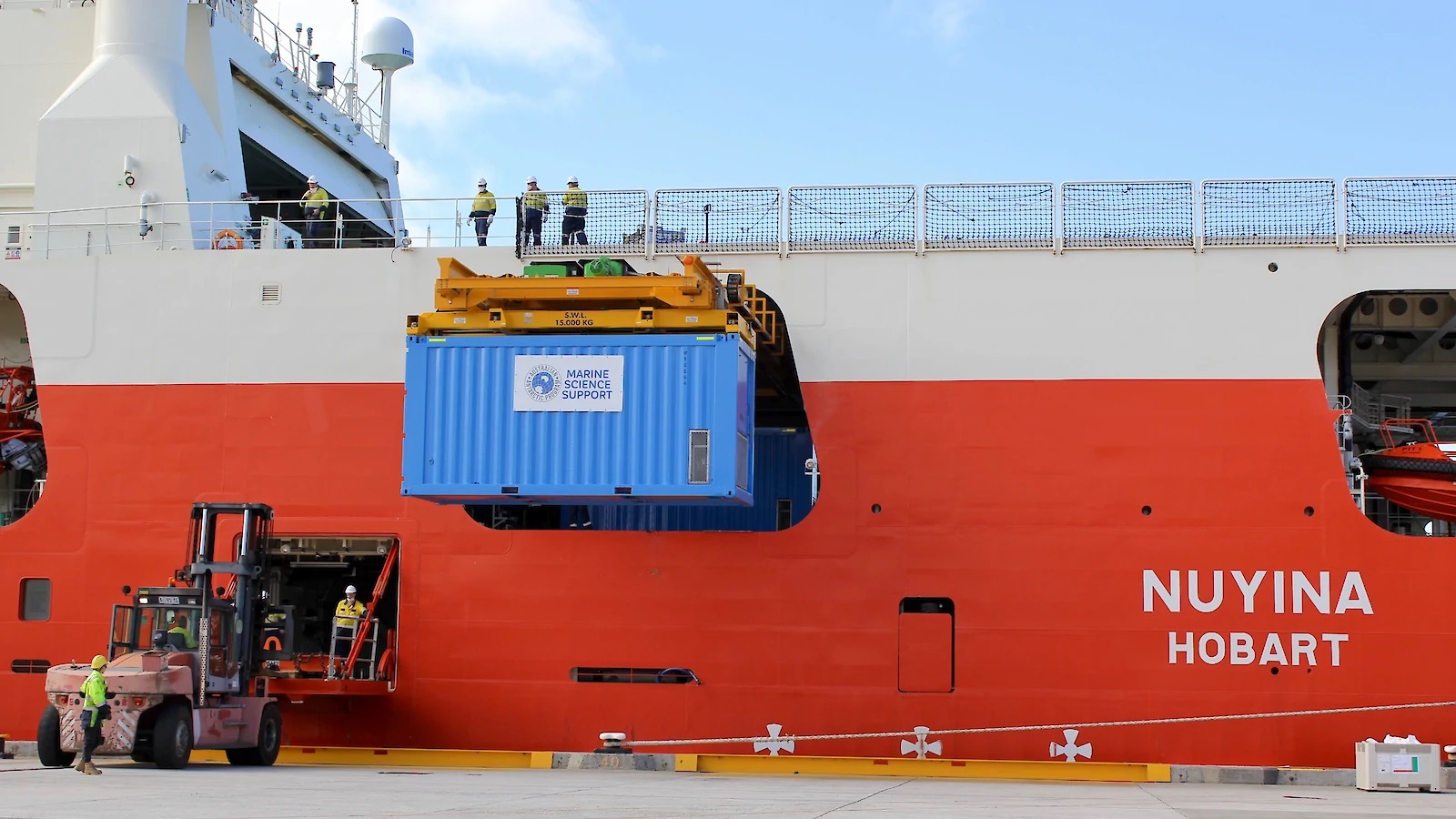 The containerised aquarium arriving on Nuyina Photo: Mark Horstman