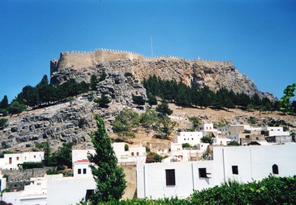 Distant view of the acropolis of Lindos with white houses in foreground.