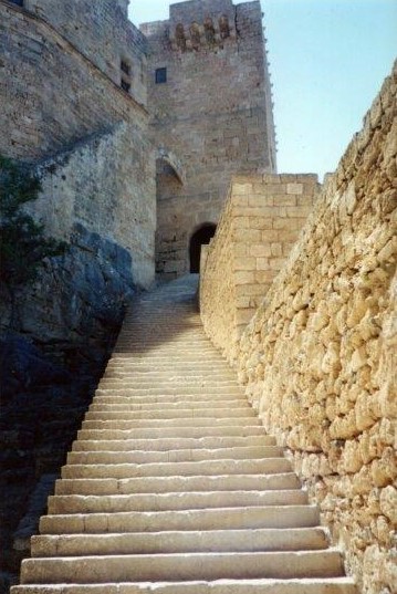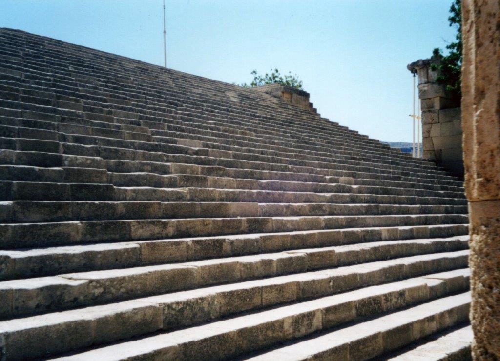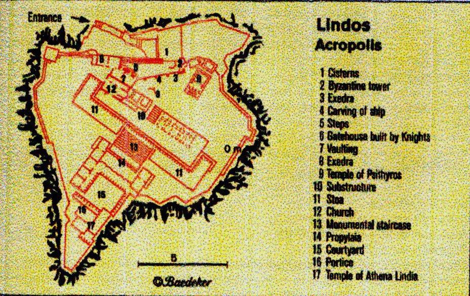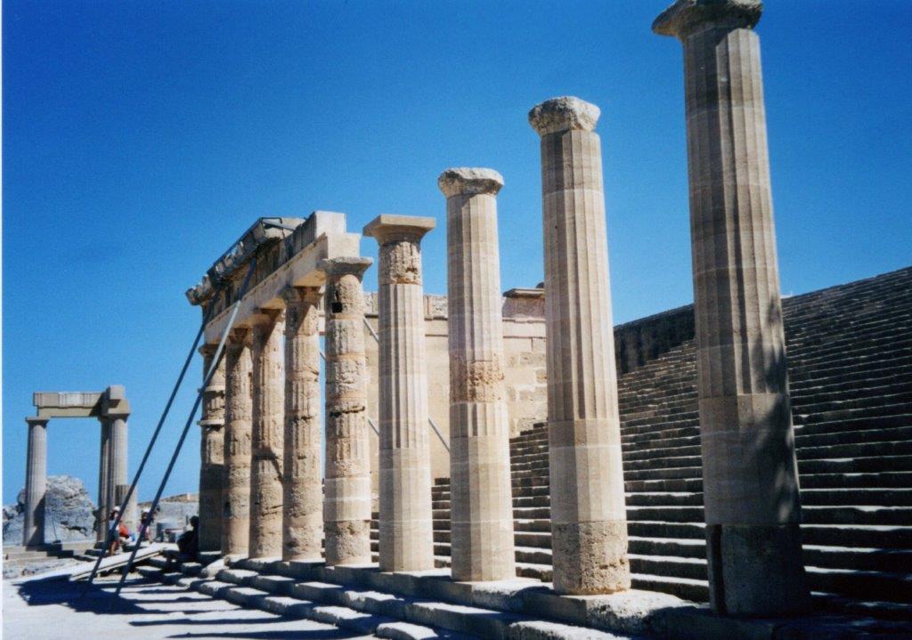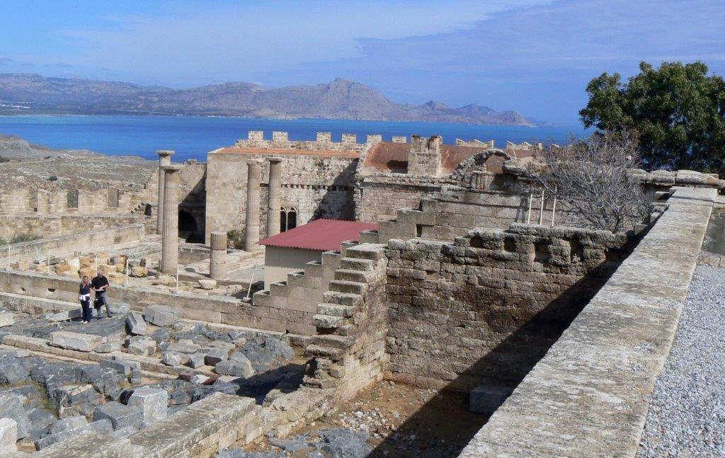 A monumental staircase 21 m. wide leads up to Propylaea of the early 3rd c BCE behind which is a courtyard surrounded by columns (not in good order) at the back of which is a comparatively modest but artistically impressive temple of Athena Lindia. The temple is only 22 meters long and 8 metres wide – but merges well into the natural environment and the arrangement of buildings on the acropolis.