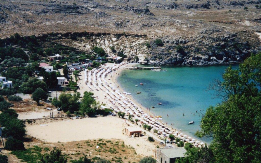 On the east coast of the island of Rhodes, about 56 Km. from the town of Rhodes, the popular tourist attraction, Lindos, is magnificently situated between two bays, with its low whitewashed houses overlooked by a medieval castle and an ancient acropolis.