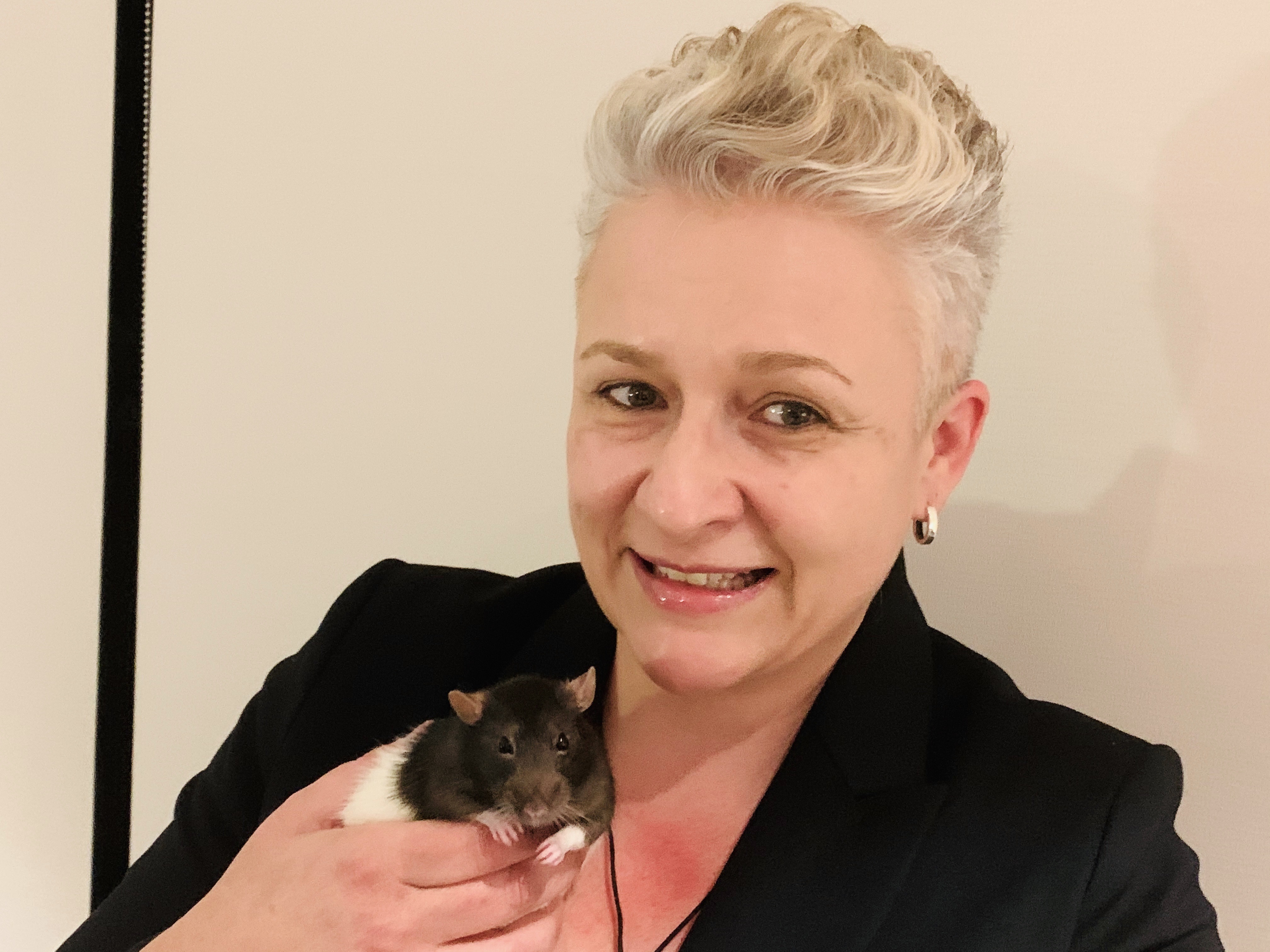 Paula Wallace and Banjo the ex-lab rat - Liberty Foundation Australia