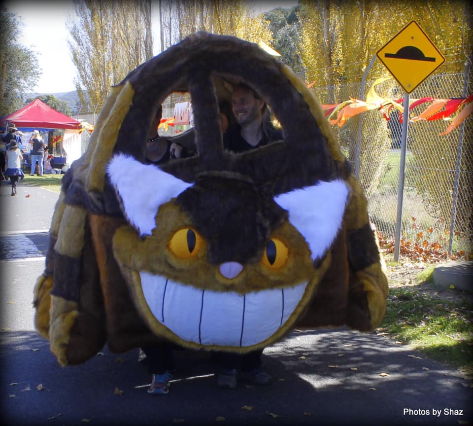 The Catbus is nearly 7ft x 4ft from head to tail. The frame is constructed from bamboo and electrical conduit. I’m not sure how much it weighs, but believe me it’s heavy! Designed to be a 4-person costume, it operates a little like the Flintstone’s car and also has a wagging tail.